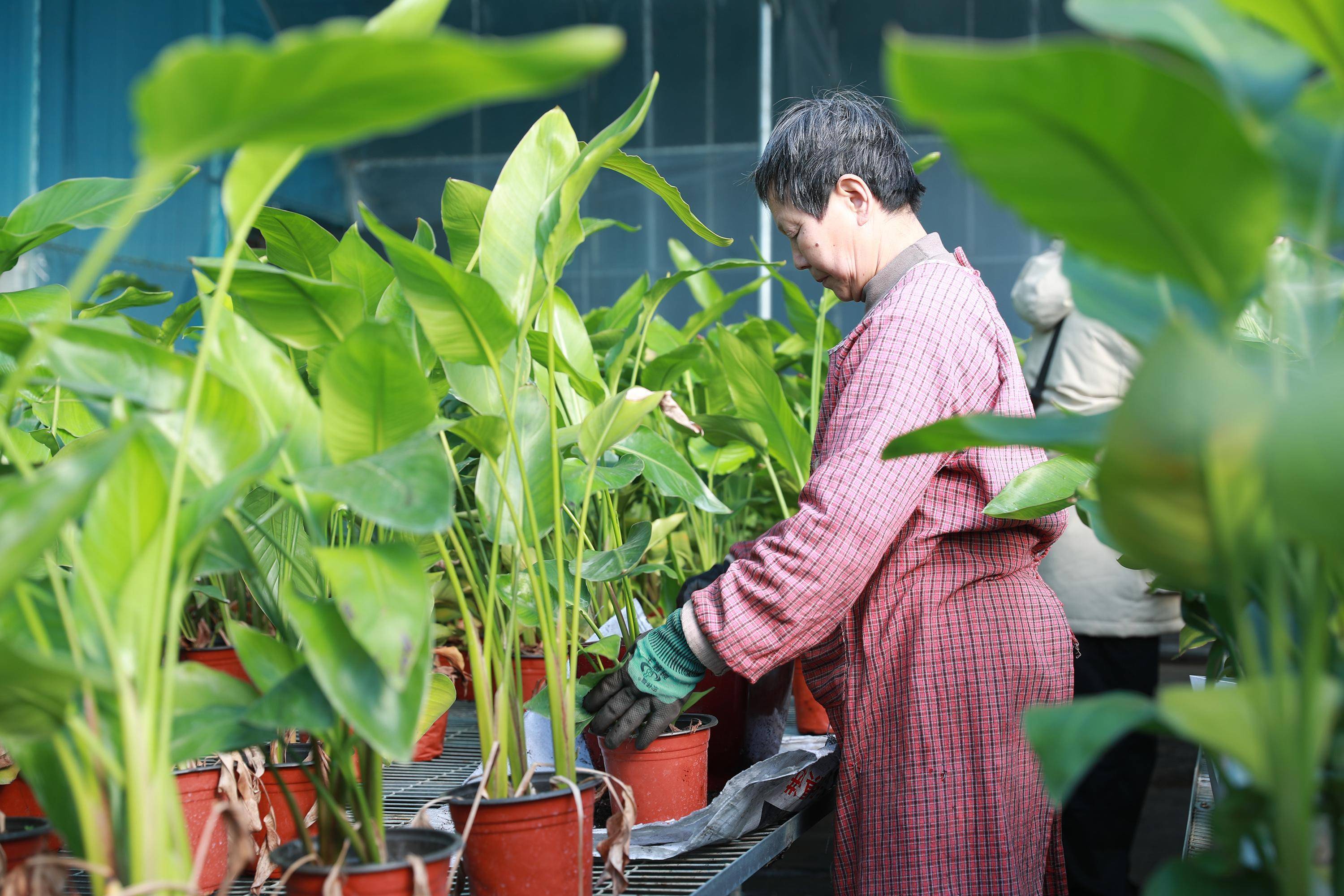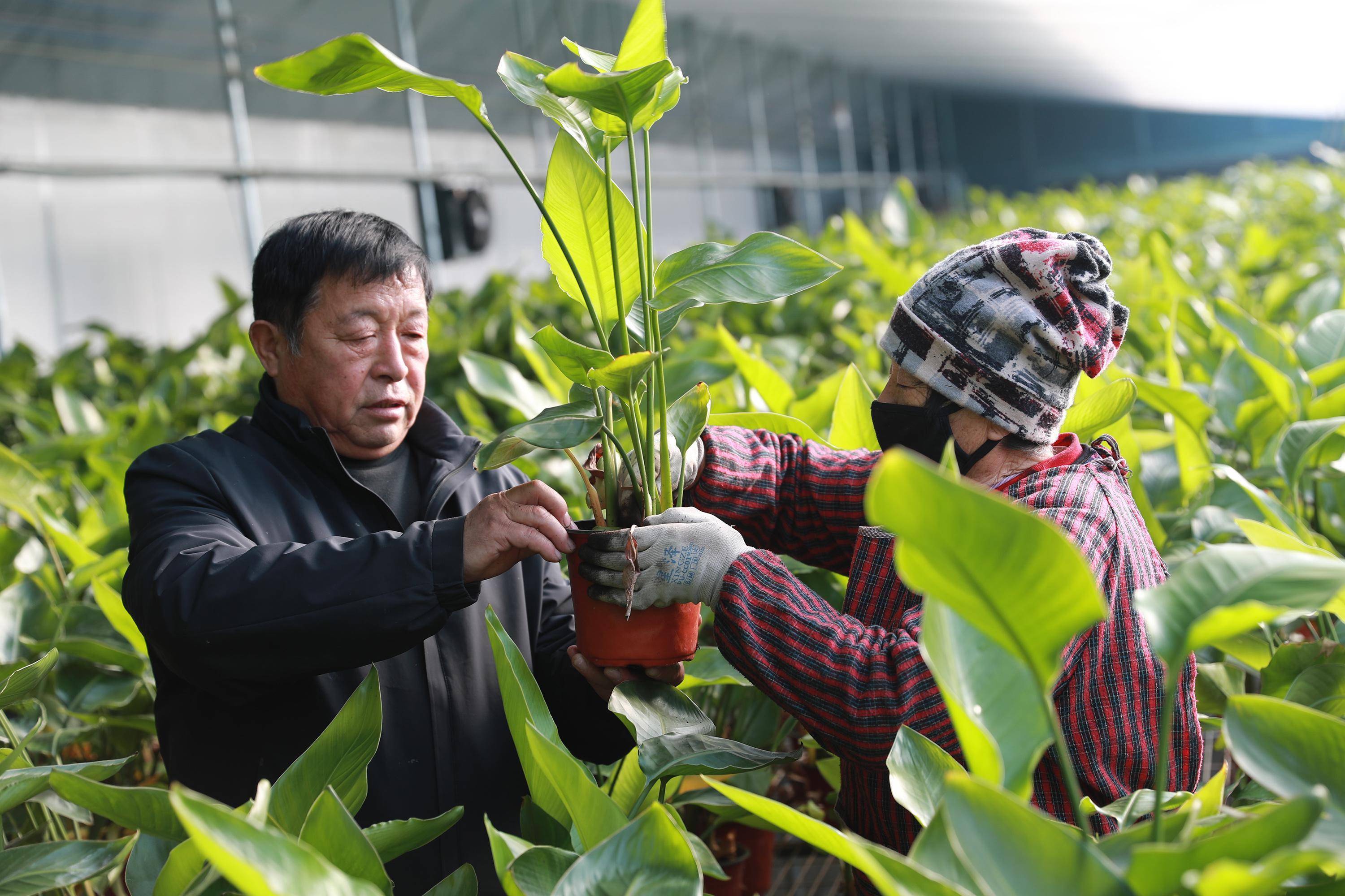 工人正在培土。赵端摄年关将至,年宵花销售进入旺季。1月13日,在位于河北省顺平县高于铺镇北城村的春源花卉种植基地,智能温室大棚内的天堂鸟长势喜人,工人们穿梭其间,正开展塑形、培土、施肥等管护工作。