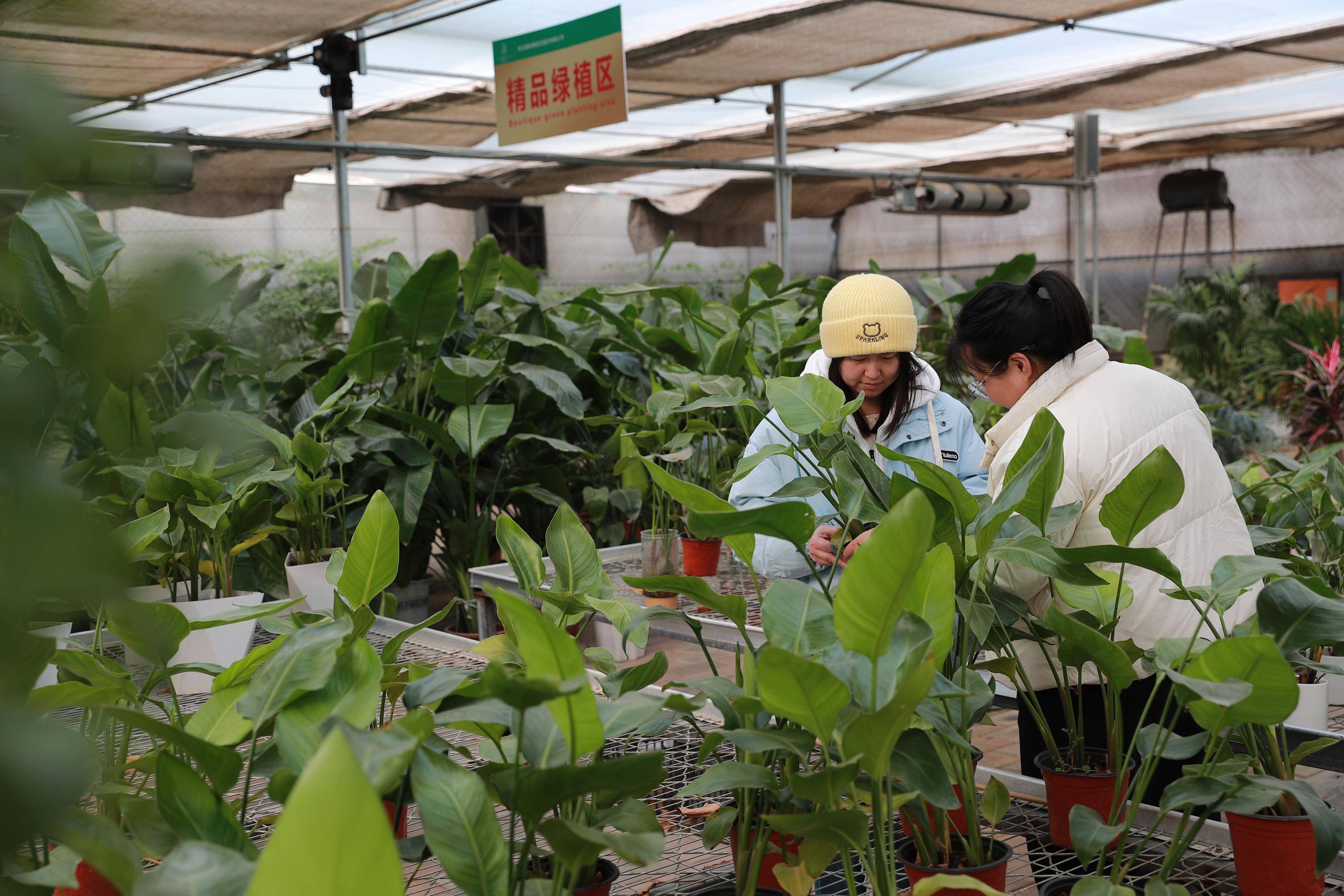 花卉销售基地绿植区,游客正挑选购买天堂鸟绿植。赵端摄