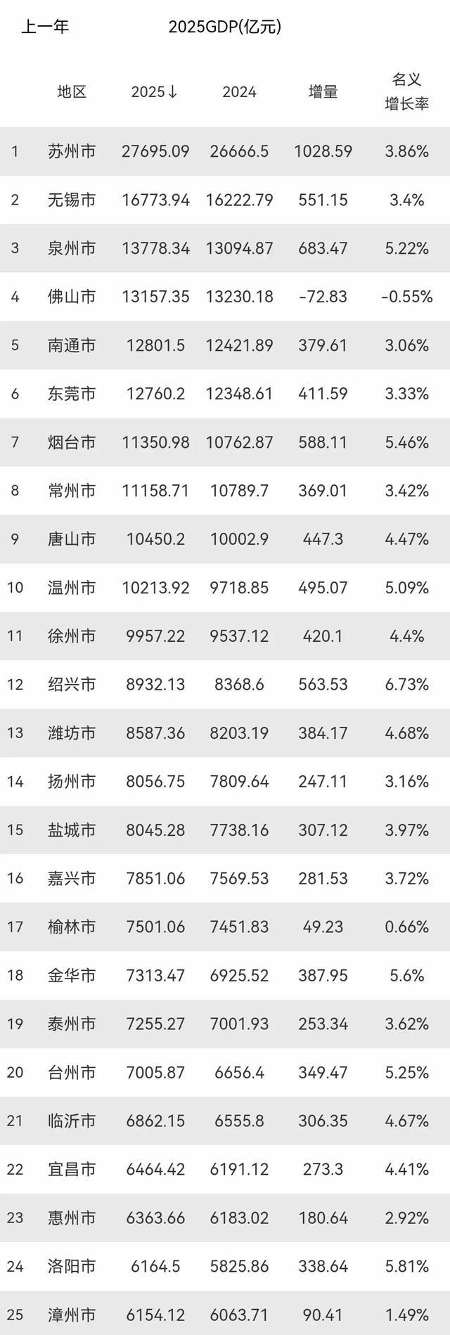 除以上四个焦点以外,总体来看也是中国区域经济发展的一个稳定的趋势。苏州的GDP为27695.09亿元依旧稳居首位,比大多数省会城市还要大得多,也印证了它在江苏省内处于最为重要的位置上。无锡市、泉州分别以16773.94亿元、13778.34亿元位居第二、第三,后面的城市仍然存在着较明显的优势,并且形成起了地级市经济实力的第一梯队。佛山市2025年的GDP为13157.35亿元,尽管仍然处于高位状态,但是与上一年相比出现了一定程度的负增长,这可能是由于该地区的产业结构出现了阶段性调整所导致的,需要在以后进行考察。南通市、东莞市两个地区以12801.5亿元、12760.2亿元的规模排在前列,并且两者之间差值很小,竞争十分激烈。