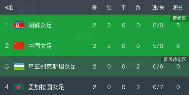 这样B组的直接出线形势明确,最新积分榜出炉,朝鲜和中国女足两连胜提前晋级,前者凭借净胜球优势暂列头名,末轮直接对话争第一。截止目前淘汰赛八强已定四席,中韩澳和朝鲜女足。