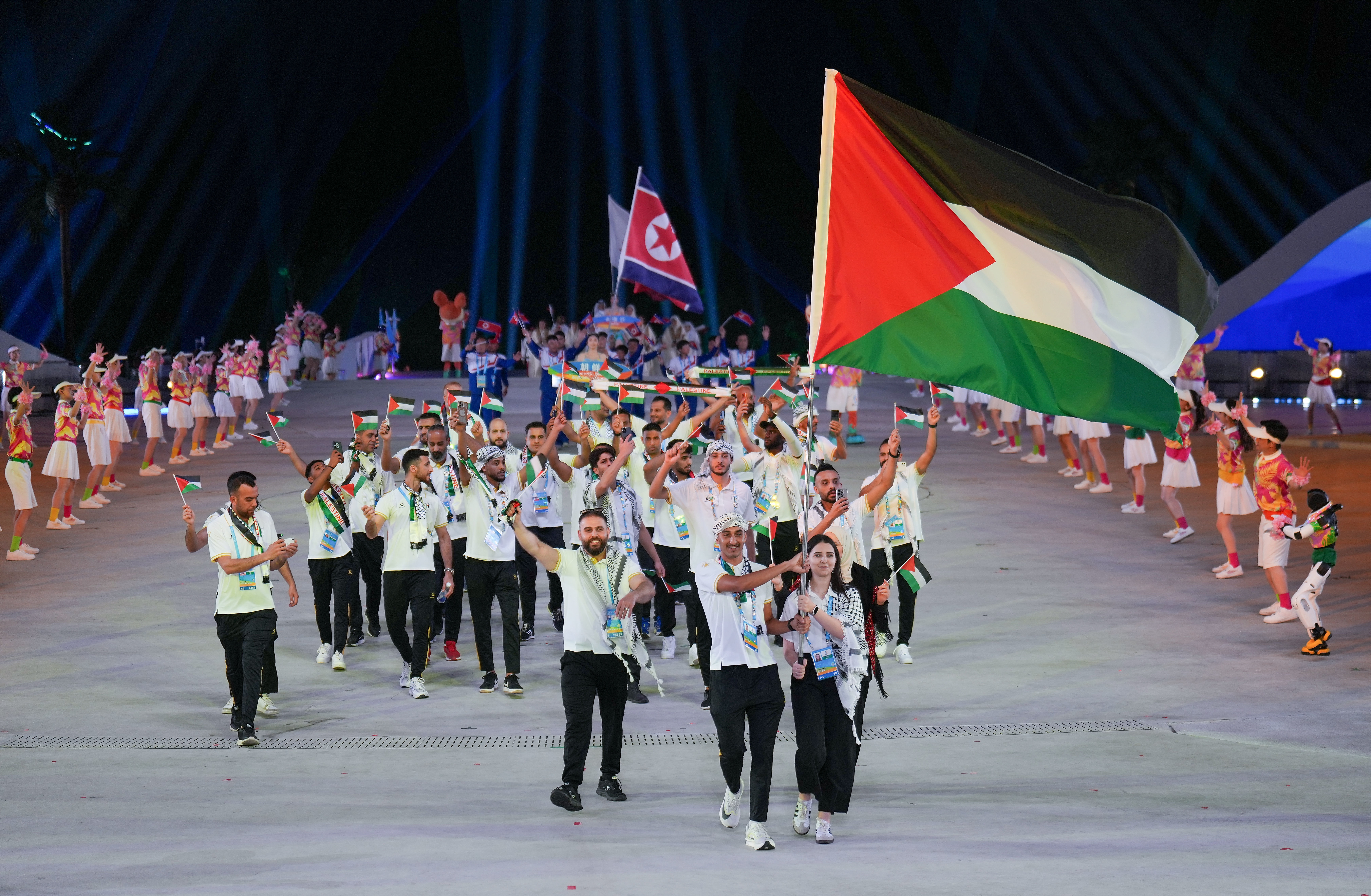 4月22日,巴勒斯坦体育代表团在开幕式上入场。新华社记者 李尕 摄