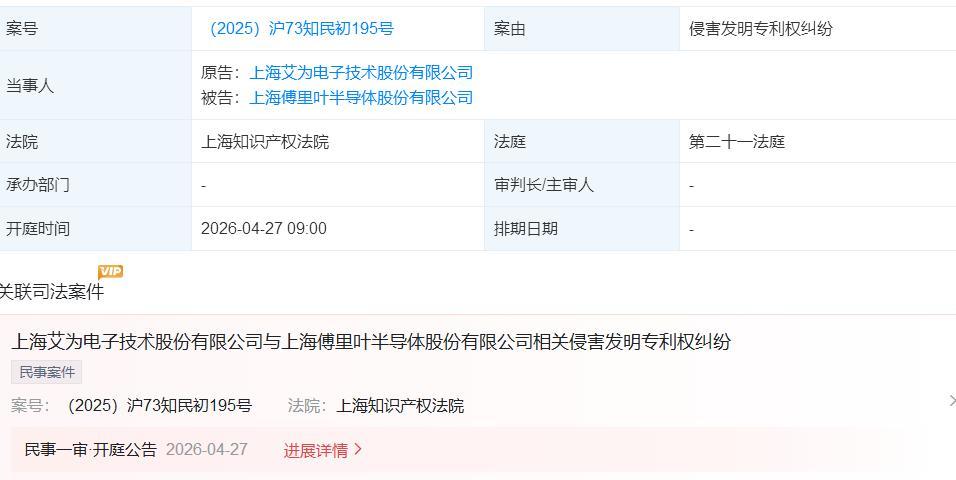 本次诉讼由国内模拟芯片龙头艾为电子发起,案件已由上海知识产权法院受理,案号(2025)沪73知民初195号,案由为侵害发明专利权纠纷,开庭时间定在2026年4月27日,恰好卡在公司路演、定价、招股的关键窗口期。