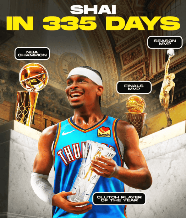 过去335天里,他斩获了多项殊荣:⭐️ NBA总冠军⭐️常规赛MVP ⭐️ 总决赛MVP ⭐️ 年度最佳关键球员。